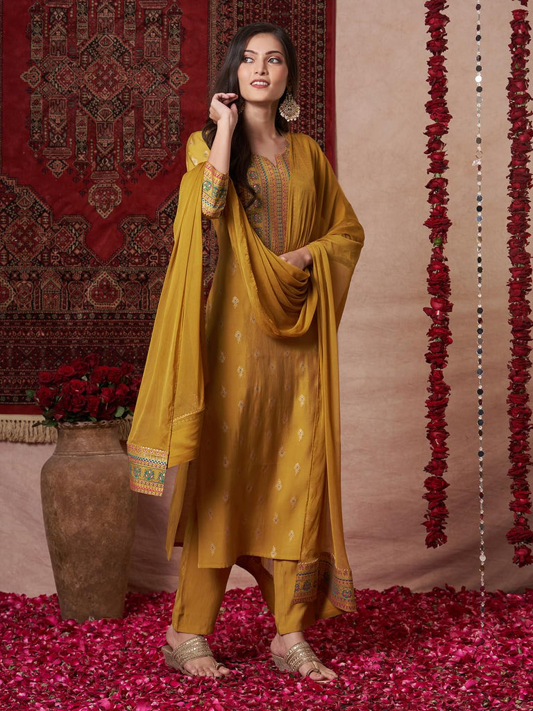 Anni Designer Women'S Rayon Blend Printed Straight Kurta With Pant & Dupatta (Toxic Mustard_S_Mustard_Small)