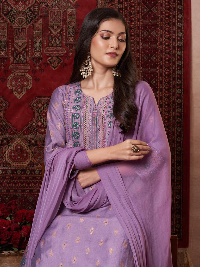 Anni Designer Women'S Rayon Blend Printed Straight Kurta With Pant & Dupatta (Toxic Purple-Vks01_L_Purple_Large),Purple,L,,,
