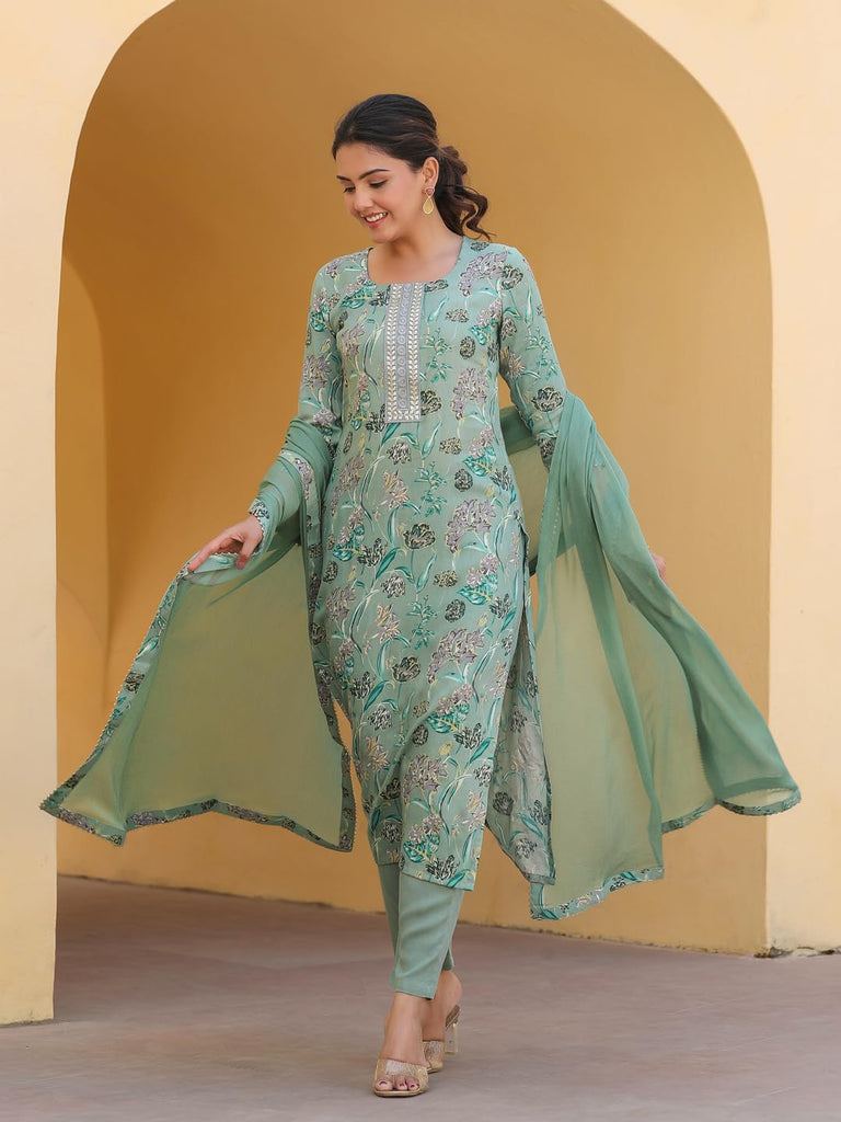 Anni Designer Women'S Rayon Blend Printed Straight Kurta With Pant & Dupatta (Vice Green-Nw_L_Green_Large)