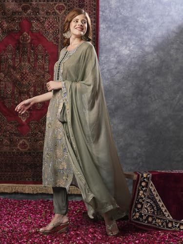 Anni Designer Women'S Rayon Blend Printed Straight Kurta With Pant & Dupatta (Vice Grey-Vks03_Xl_Grey_X-Large),Grey,XL,Rayon Blend,Regular,