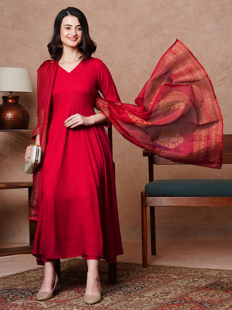Anni Designer Women'S Rayon Blend Solid Anarkali Kurta With Pant & Dupatta (Magic-Red-Nb_M_Red_Medium)