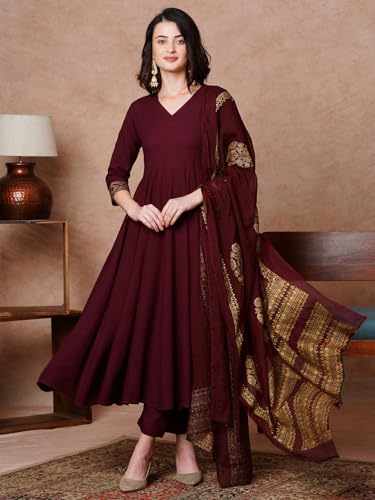 Anni Designer Women'S Rayon Blend Solid Anarkali Kurta With Pant & Dupatta (Magic-Wine-Nb_4Xl_Wine_Xxxx-Large),Wine,4XL,Rayon Blend,Anarkali,