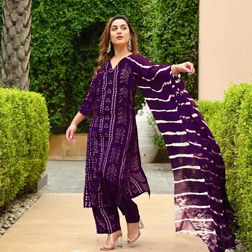 Anni Designer Women'S Rayon Blend Straight Bandhej Printed Kurta With Pant & Dupatta (Baghira Begani-Vks01_Xxl_Begani_Xx-Large),Begani,2XL,Rayon Blend,Regular,Dupatta