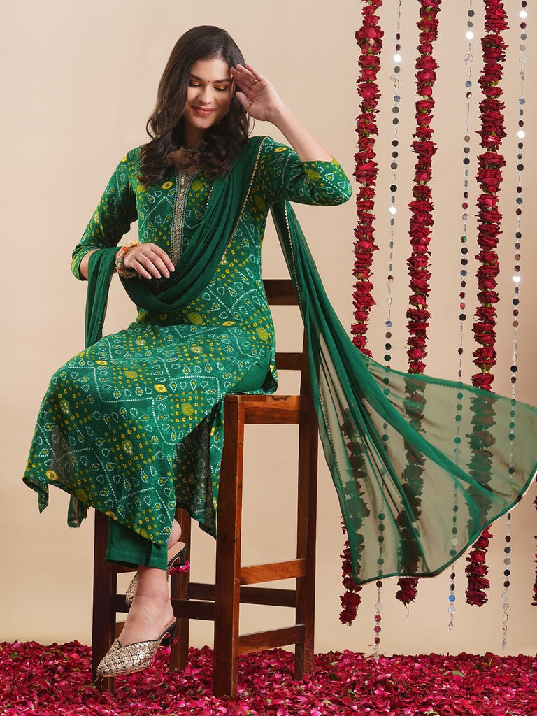 Anni Designer Women'S Rayon Blend Straight Bandhej Printed Kurta With Pant & Dupatta (Turae Green-Vks02_M_Green_Medium)