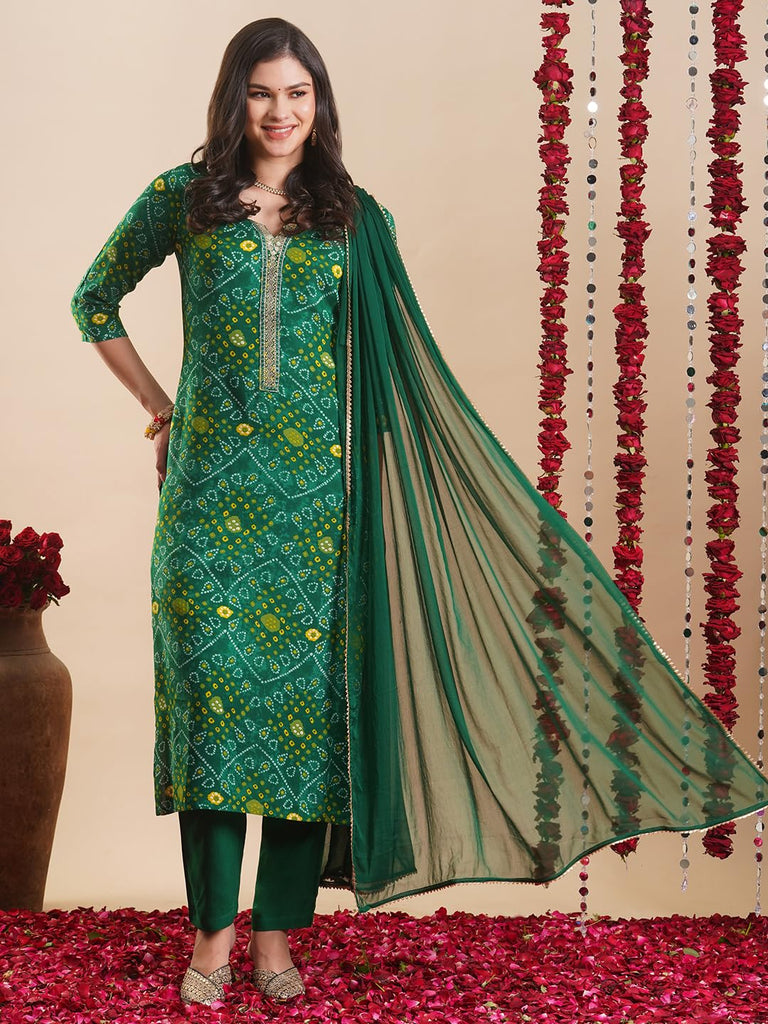 Anni Designer Women'S Rayon Blend Straight Bandhej Printed Kurta With Pant & Dupatta (Turae Green-Vks02_Xxl_Green_Xx-Large),Green,2XL,,,