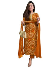 Anni Designer Women'S Rayon Blend Straight Bandhej Printed Kurta With Pant & Dupatta (Turae Mustard-Vks01_Xl_Mustard_X-Large)
