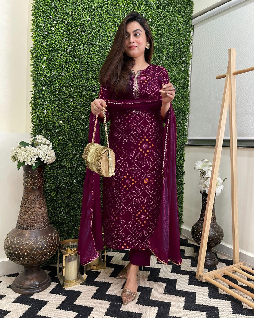 Anni Designer Women'S Rayon Blend Straight Bandhej Printed Kurta With Pant & Dupatta (Turae Wine-Vks01_L_Wine_Large)