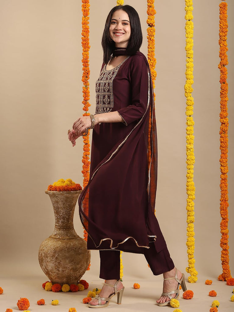 Anni Designer Women'S Rayon Blend Straight Embroidered Kurta With Pant & Dupatta (Togas Wine_Xxl_Wine_Xx-Large),Wine,2XL,Rayon Blend,Regular,