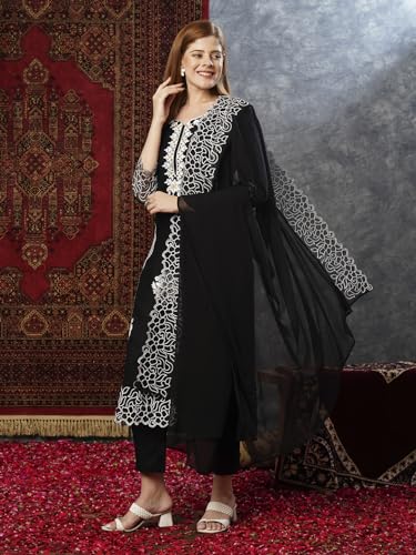 Anni Designer Women'S Rayon Blend Straight Embroidered Kurta With Pant & Dupatta (Trp Black-Jl_Xxl_Black_Xx-Large),Black,2XL,Cotton Blend,Regular,