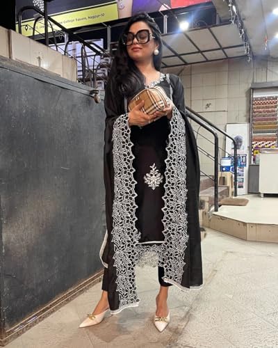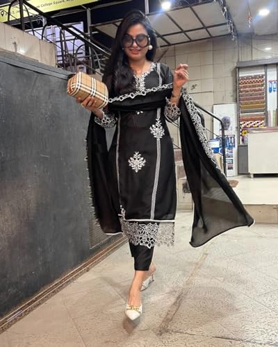 Descriptionanni Designer Women'S Rayon Blend Straight Embroidered Kurta With Pant & Dupatta (Trp Black_3Xl_Black_Xxx-Large)