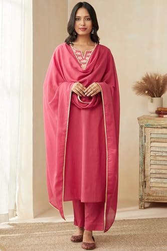 Anni Designer Women'S Rayon Blend Straight Embroidered Kurta With Pant & Dupatta (Vasudhara Pink_L_Pink_Large),Pink,L,Rayon Blend,Regular,