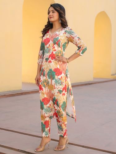Anni Designer Women'S Rayon Blend Straight Fit Printed Kurta With Pant (Samlok White_S_White_Small),White,S,Rayon Blend,Regular,