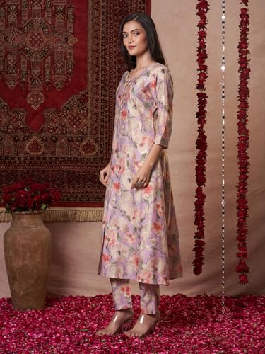 Anni Designer Women'S Rayon Blend Straight Printed Kurta With Pant (Bhaskar Lavender_M_Lavender_Medium),Lavender,M,Rayon Blend,A-Line,