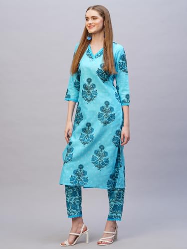 Anni Designer Women'S Rayon Blend Straight Printed Kurta With Pant (Cheer Blue_Xl_Blue_X-Large),Blue,XL,Rayon Blend,Regular,