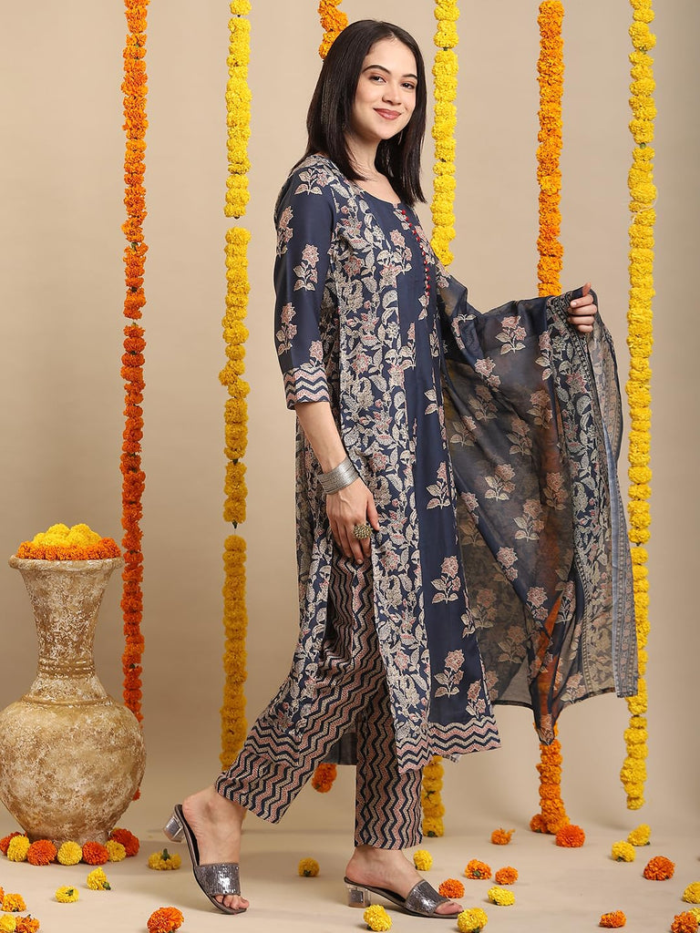 Anni Designer Women'S Rayon Blend Straight Printed Kurta With Pant & Dupatta (Alaya Navy Blue-Vks01_M_Navy Blue_Medium),Navy Blue,M,,,