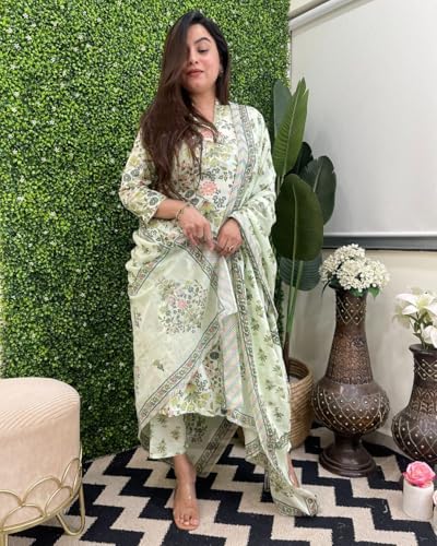 Anni Designer Women'S Rayon Blend Straight Printed Kurta With Pant & Dupatta (Fuldani Green_M_Green_Medium),Green,M,Rayon Blend,Regular,