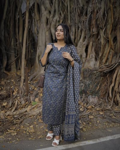 Anni Designer Women'S Rayon Blend Straight Printed Kurta With Pant & Dupatta (Kamiganj Blue_Xxl_Blue_Xx-Large),Blue,2XL,Rayon Blend,Regular,Dupatta