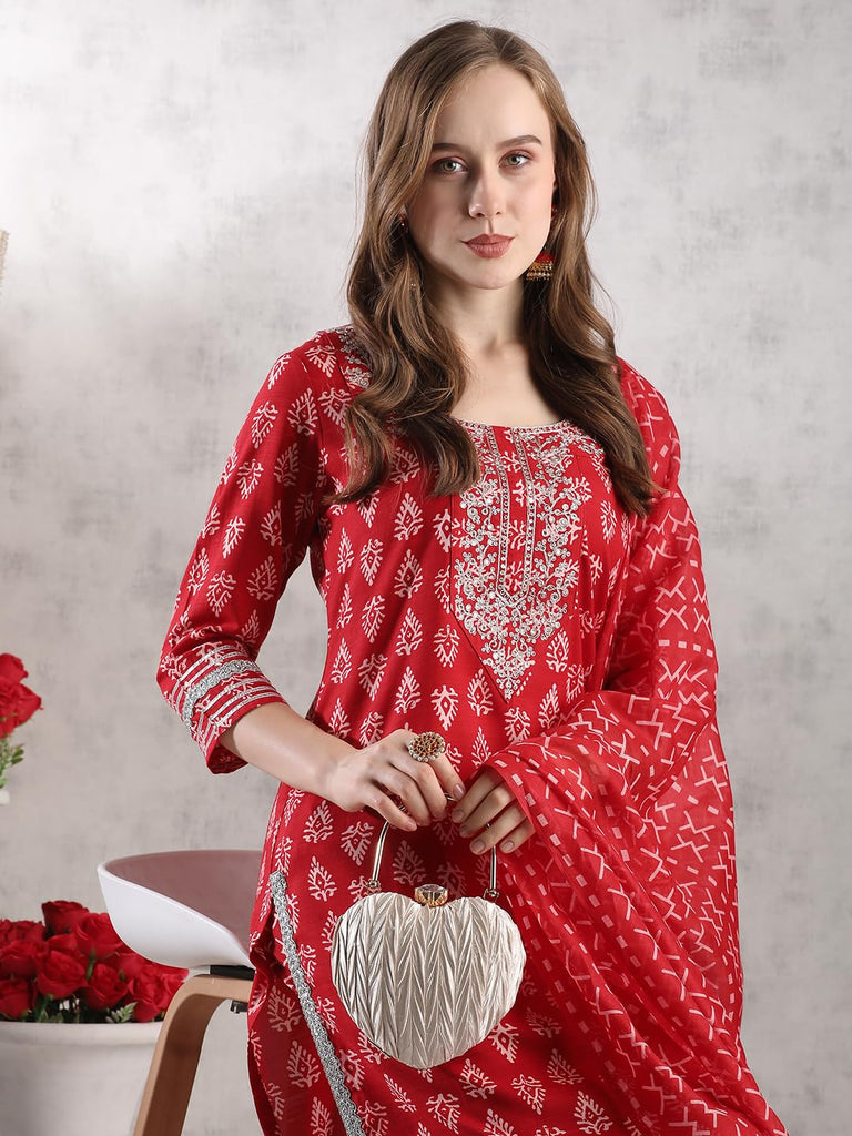 Anni Designer Women'S Rayon Blend Straight Printed Kurta With Pant & Dupatta (Maasa Red-Vks02_M_Red_Medium)