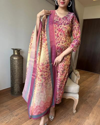 Anni Designer Women'S Rayon Blend Straight Printed Kurta With Pant & Dupatta (Omsing Pink_S_Pink_Small),Pink,S,Rayon Blend,Regular,