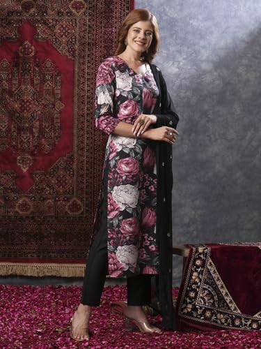 Anni Designer Women'S Rayon Blend Straight Printed Kurta With Pant & Dupatta (Poona Black-Vks01_3Xl_Black_Xxx-Large),Black,3XL,Rayon Blend,Regular,