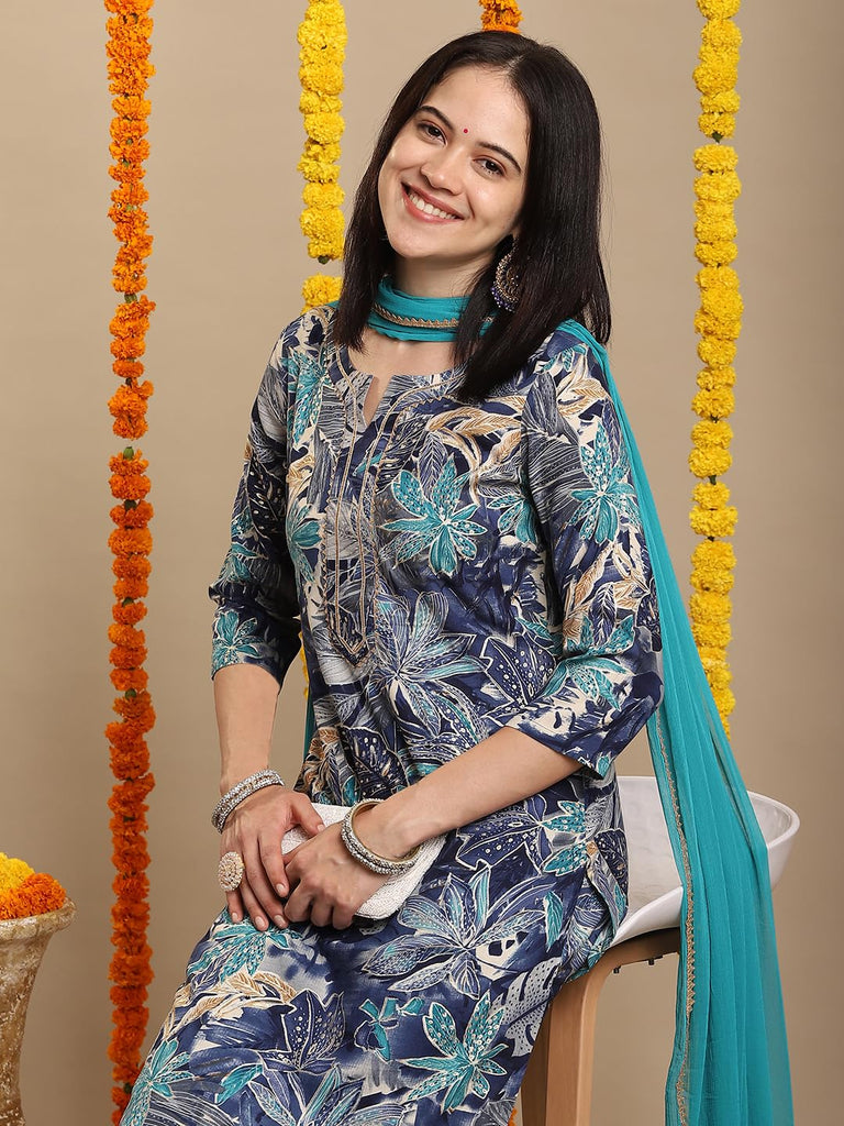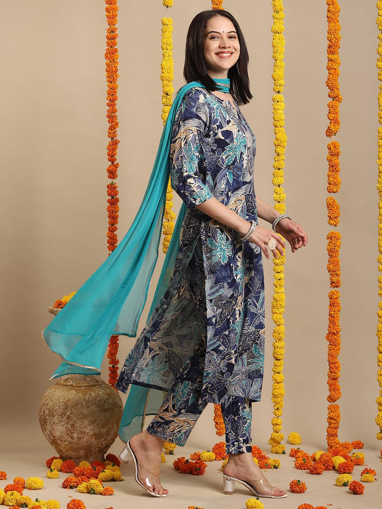 Anni Designer Women'S Rayon Blend Straight Printed Kurta With Pant & Dupatta (Rishi Blue_M_Blue_Medium)