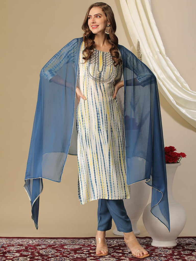 Anni Designer Women'S Rayon Blend Straight Printed Kurta With Pant & Dupatta (Tiedye Light Blue-Nw_M_Light Blue_Medium)