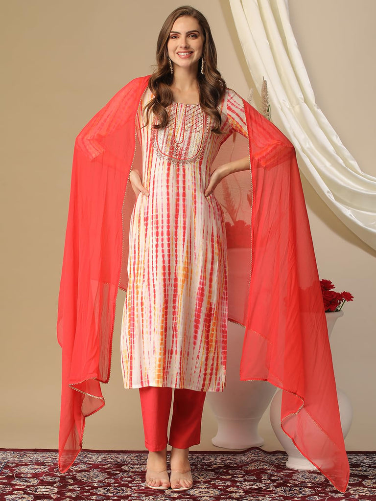 Anni Designer Women'S Rayon Blend Straight Printed Kurta With Pant & Dupatta (Tiedye Red-Nw_L_Red_Large)