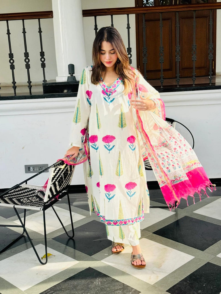 Anni Designer Women'S Rayon Blend Straight Printed Kurta With Pant & Dupatta (Ziggi White_M_White_Medium)