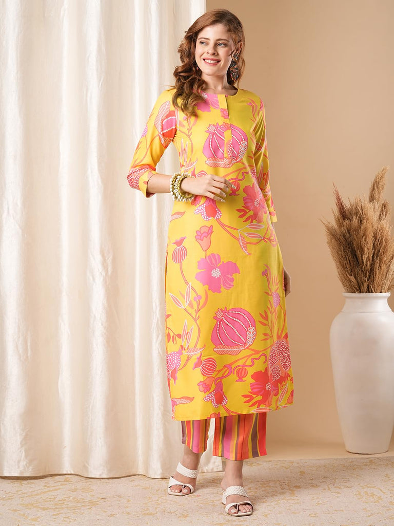 Anni Designer Women'S Rayon Blend Straight Printed Kurta With Pant (Kalol Yellow-Vks01_S_Yellow_Small)