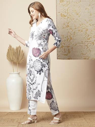 Anni Designer Women'S Rayon Blend Straight Printed Kurta With Pant (Satyapra White_Xxl_White_Xx-Large),White,2XL,Rayon Blend,Regular,Kurta