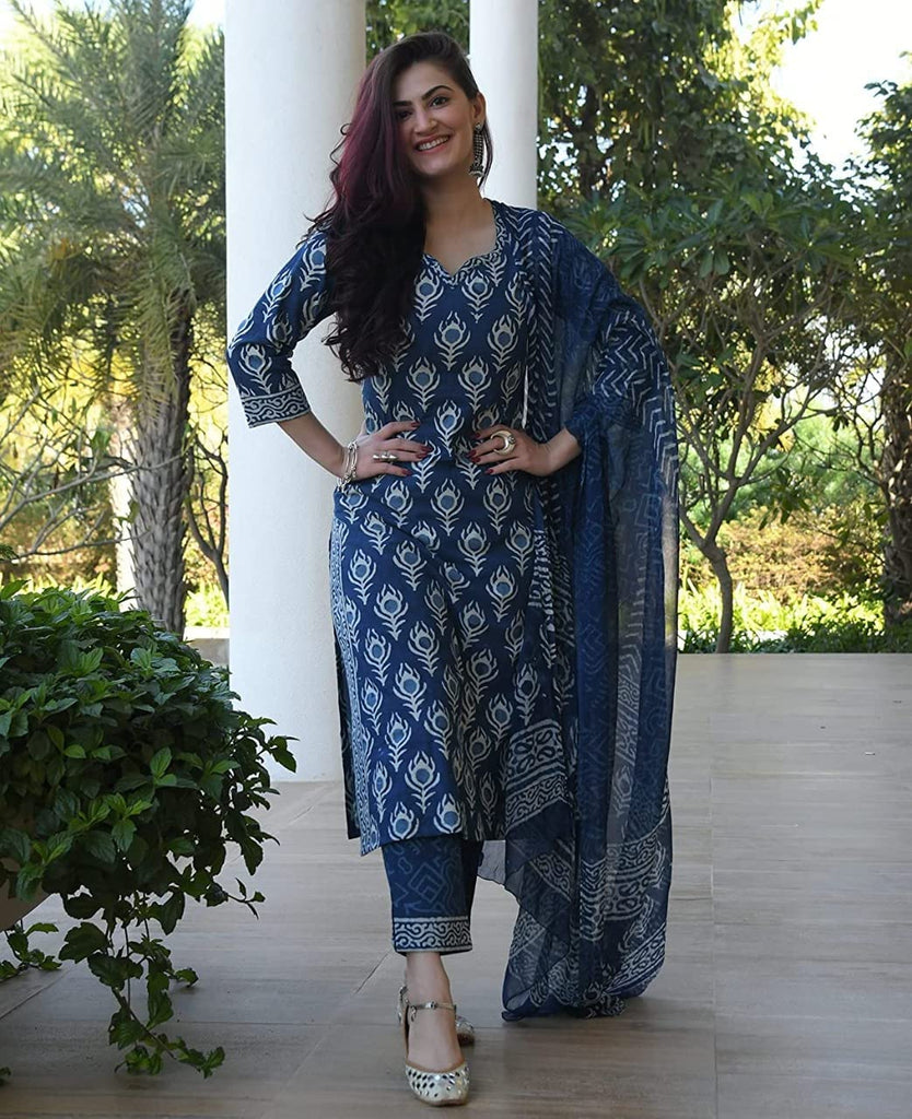 Anni Designer Women'S Rayon Straight Printed Kurta With Pant & Dupatta (Bulgeriya-Blue_Xxl_Blue_Xx-Large),Blue,2XL,Rayon,Straight,Pants, Dupatta