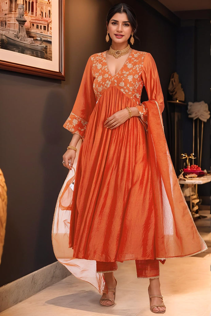Anni Designer Women'S Rayon Viscose Anarkali Embroidered Kurta With Pant & Dupatta (Kanakam Orange-Vks02_Xl_Orange_X-Large),Orange,XL,Rayon,Anarkali,