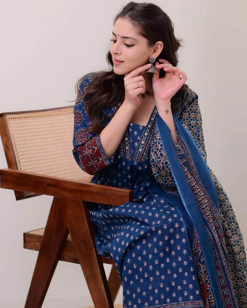 Anni Designer Women'S Rayon Viscose Anarkali Printed Kurta With Palazzo & Dupatta (Nakula Blue_Xl_Blue_X-Large)