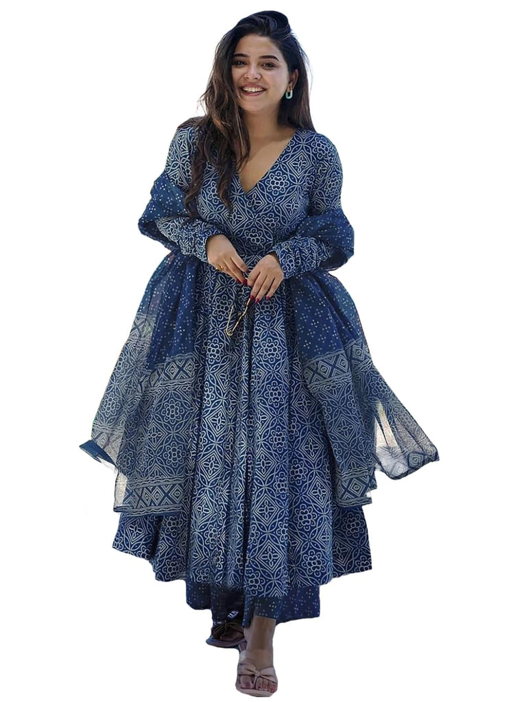 Anni Designer Women'S Rayon Viscose Anarkali Printed Kurta With Palazzo & Dupatta (Sinners Blue_M_Blue_Medium),Blue,M,Rayon Blend,Classic,