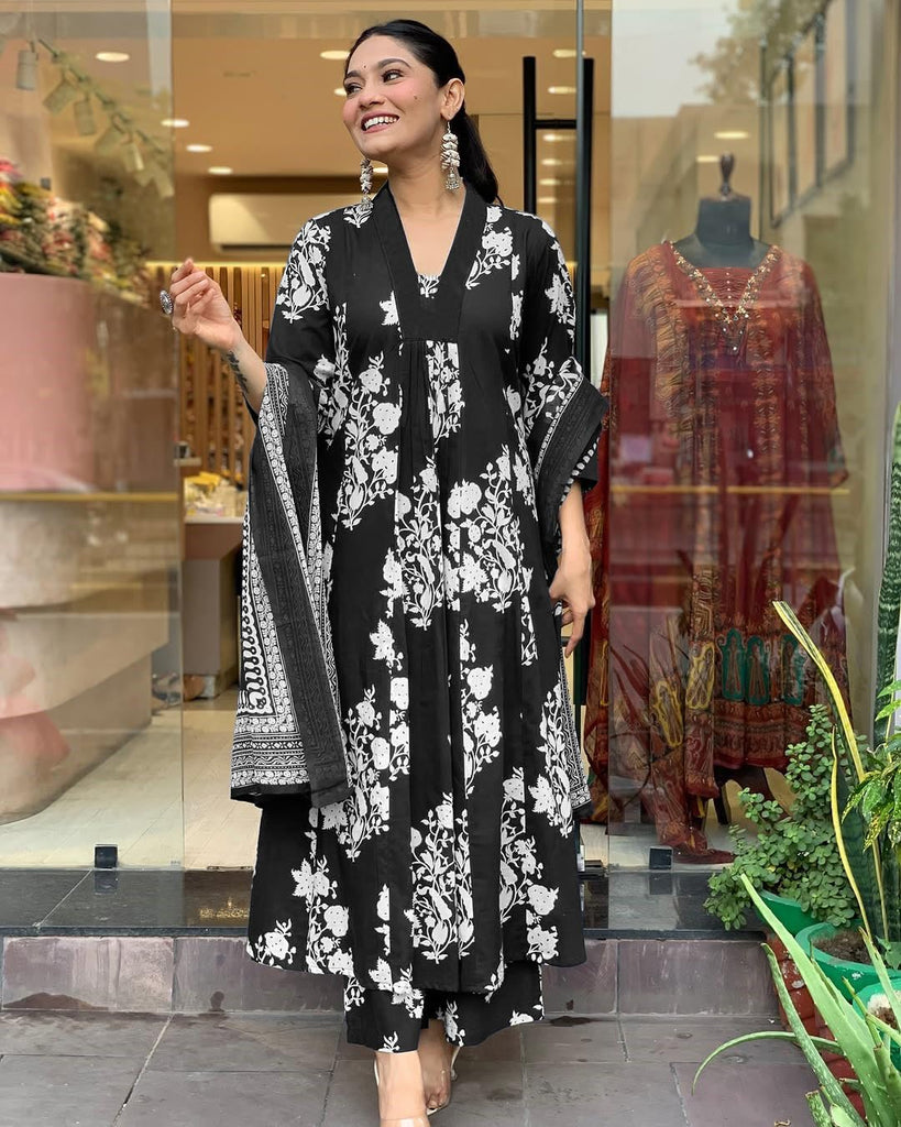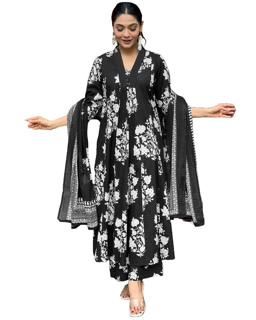 Anni Designer Women'S Rayon Viscose Anarkali Printed Kurta With Pant & Dupatta (Jasiwal Black_Xxl_Black_Xx-Large),Black,2XL,Rayon Blend,A-Line,