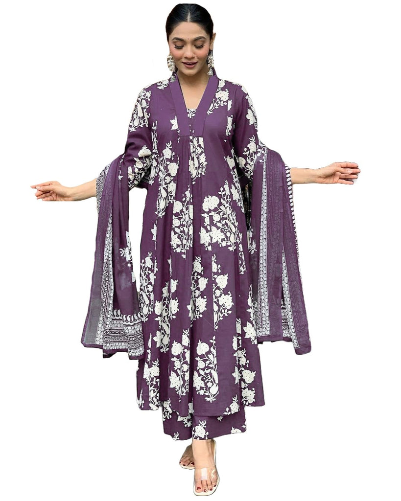 Anni Designer Women'S Rayon Viscose Anarkali Printed Kurta With Pant & Dupatta (Jasiwal Purple_S_Purple_Small),Purple,S,Rayon Blend,A-Line,