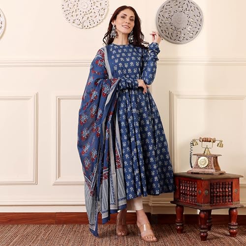 Anni Designer Women'S Rayon Viscose Anarkali Printed Kurta With Pant & Dupatta (Menon Blue_M_Blue_Medium),Blue,M,Rayon Blend,Anarkali,