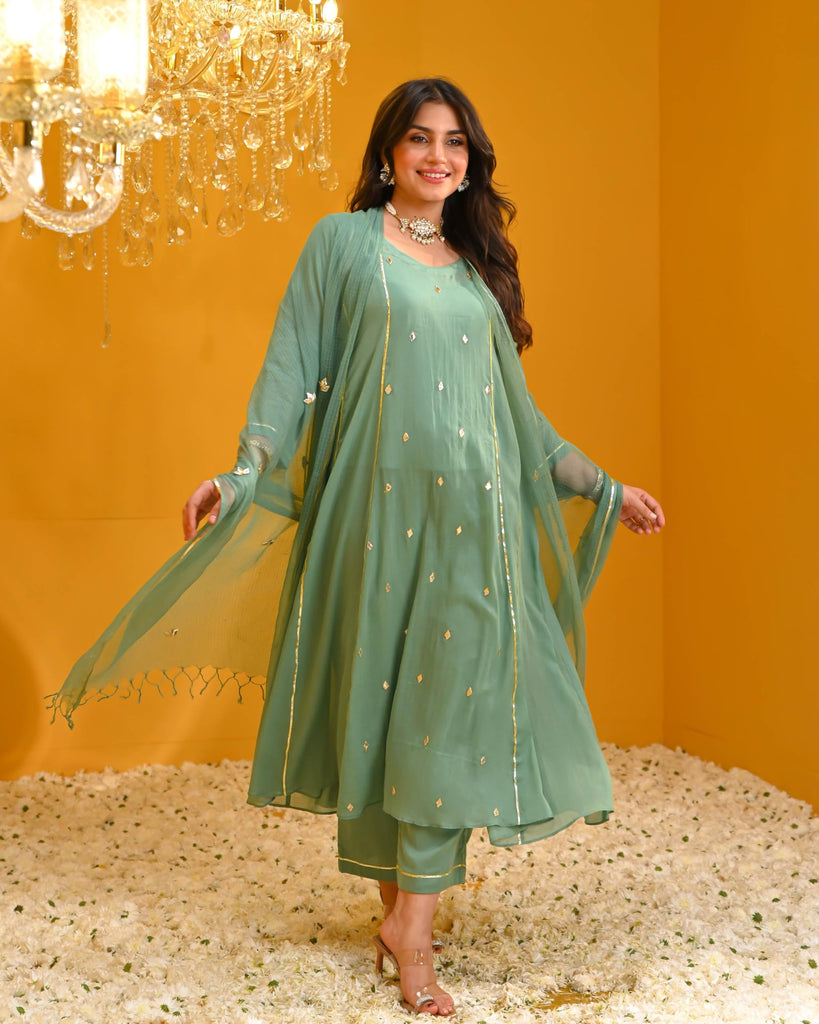 Anni Designer Women'S Rayon Viscose Embellished Anarkali Kurta With Pant & Dupatta (Tapuram Green_Xxl_Green_Xx-Large),Green,2XL,Rayon Blend,Anarkali,