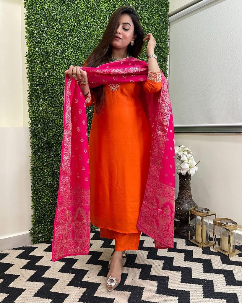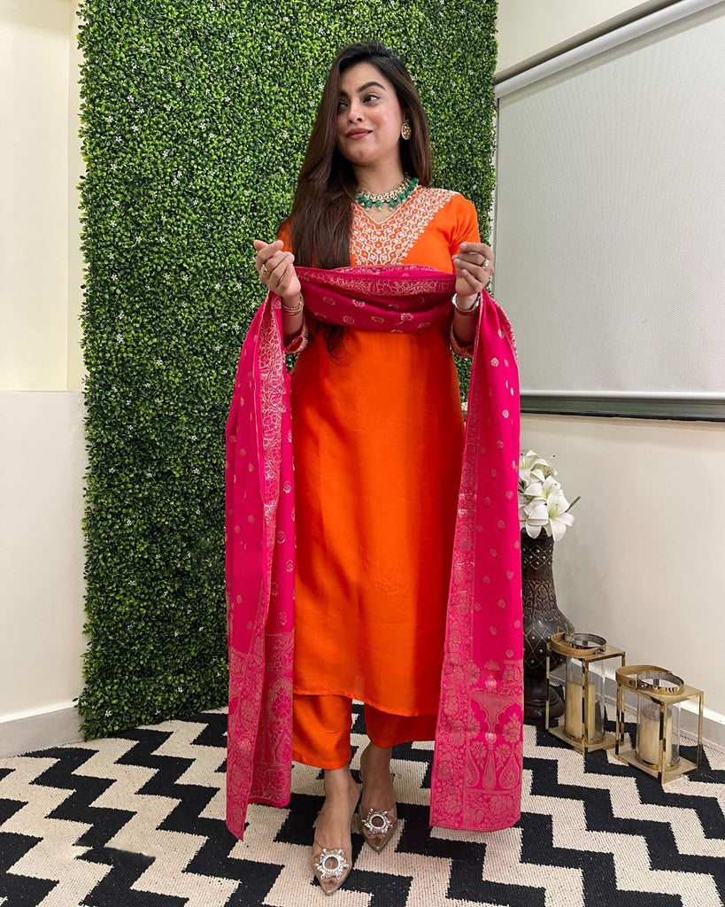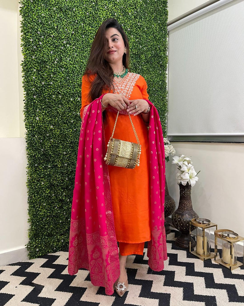 Anni Designer Women'S Rayon Viscose Embroidered Straight Kurta With Pant & Dupatta (Kalsubai Orange_Xxl_Orange_Xx-Large),Orange,2XL,,,