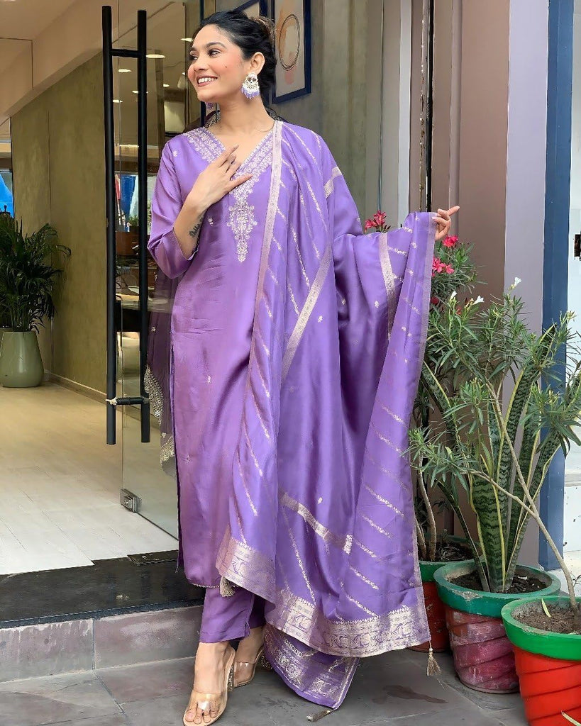 Anni Designer Women'S Rayon Viscose Embroidered Straight Kurta With Pant & Dupatta (Paritosh Purple_L_Purple_Large),Purple,L,,,