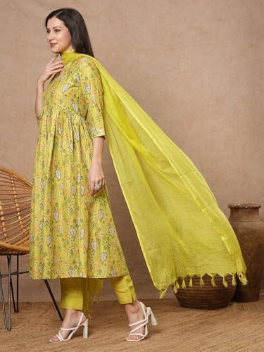 Anni Designer Women'S Rayon Viscose Printed Anarkali Kurta With Pant & Dupatta (Horizon Green-Vks01_L_Green_Large),Green,L,Rayon,Anarkali,