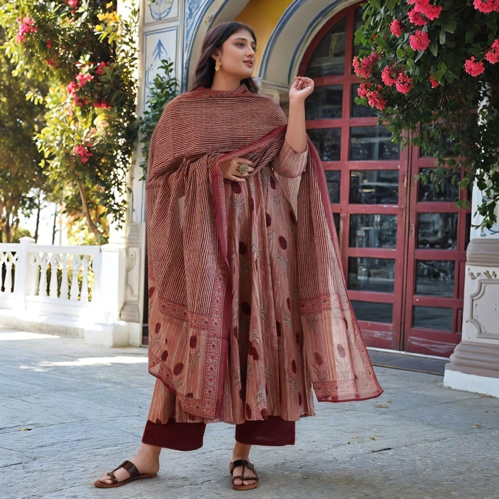Anni Designer Women'S Rayon Viscose Printed Anarkali Kurta With Pant & Dupatta (Prisha Wine-Vks01_Xxl_Wine_Xx-Large)