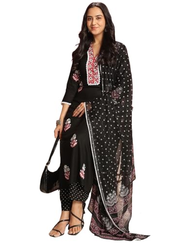 Anni Designer Women'S Rayon Viscose Printed Straight Kurta With Pant & Dupatta (Belagavi Black-Vks04_M_Black_Medium)