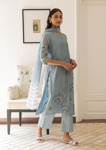 Anni Designer Women'S Rayon Viscose Printed Straight Kurta With Pant & Dupatta (Gana Blue_L_Blue_Large),Blue,L,Rayon Blend,Classic,