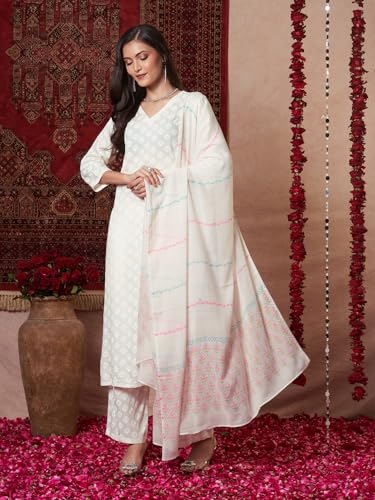 Anni Designer Women'S Rayon Viscose Printed Straight Kurta With Pant & Dupatta (Mirai White-Vks03_5Xl_White_Xxxxx-Large),White,5XL,Rayon,Casual,