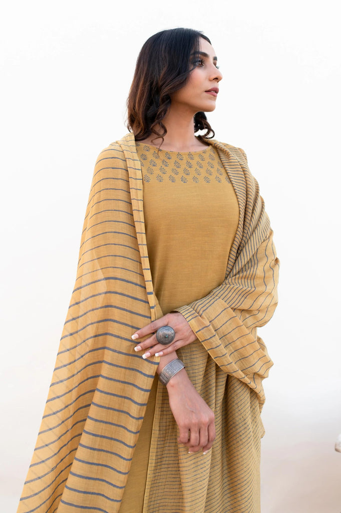 The kurta set is primarily yellow, but please note that there may be slight color variations due to different screen resolutions.