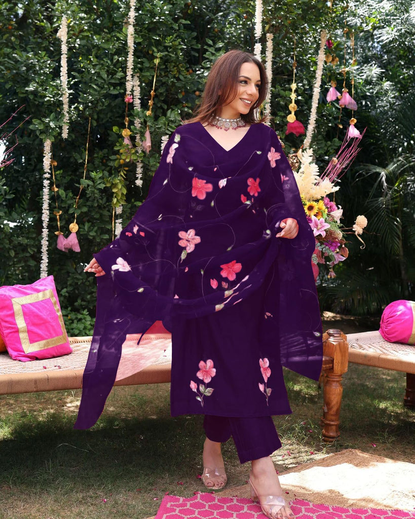 The set includes one kurta, one pair of trousers, and one dupatta.