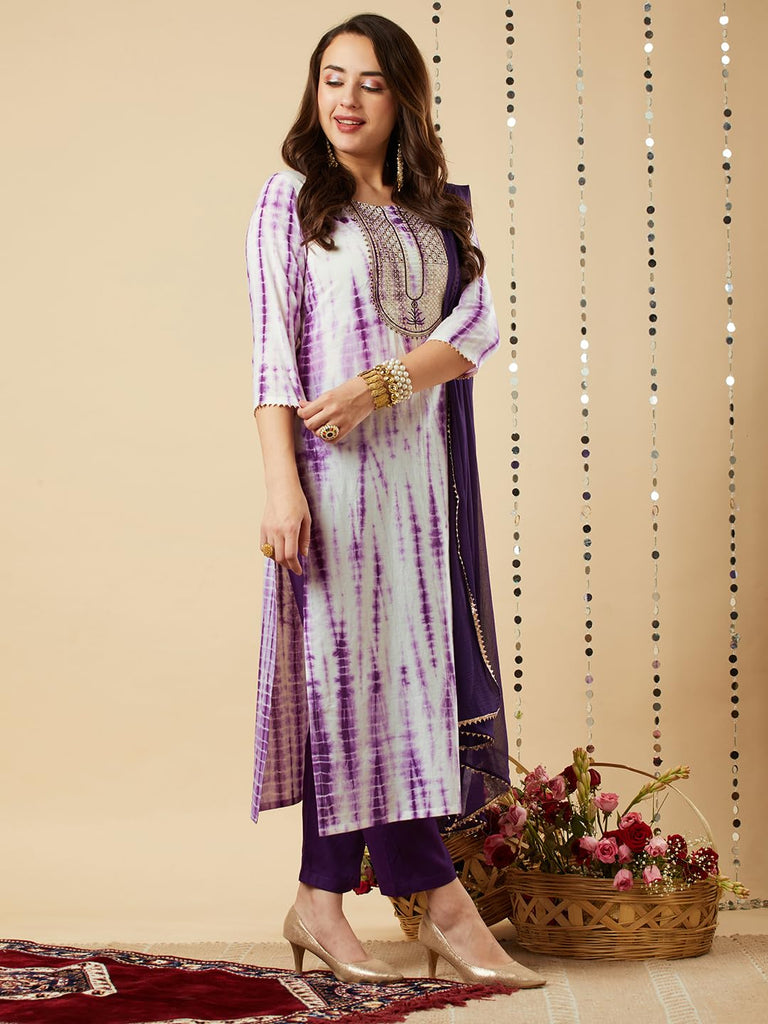Anni Designer Women'S Rayon Viscose Printed Straight Kurta With Pant & Dupatta (Tiedye Begani-Vks01_3Xl_Violet_Xxx-Large),Violet,3XL,,,