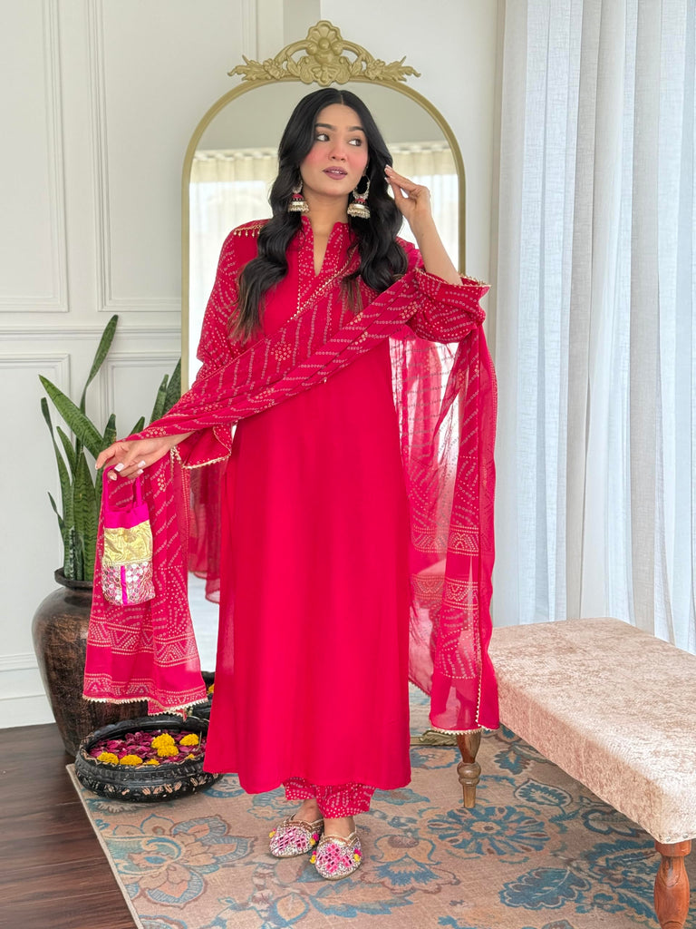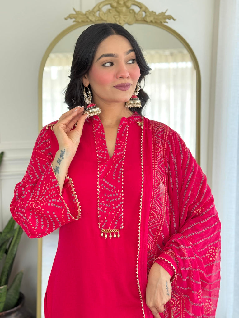 Anni Designer Women'S Rayon Viscose Straight Bandhej Printed Kurta With Pant & Dupatta (Kriva Pink-Vks01_L_Pink_Large)