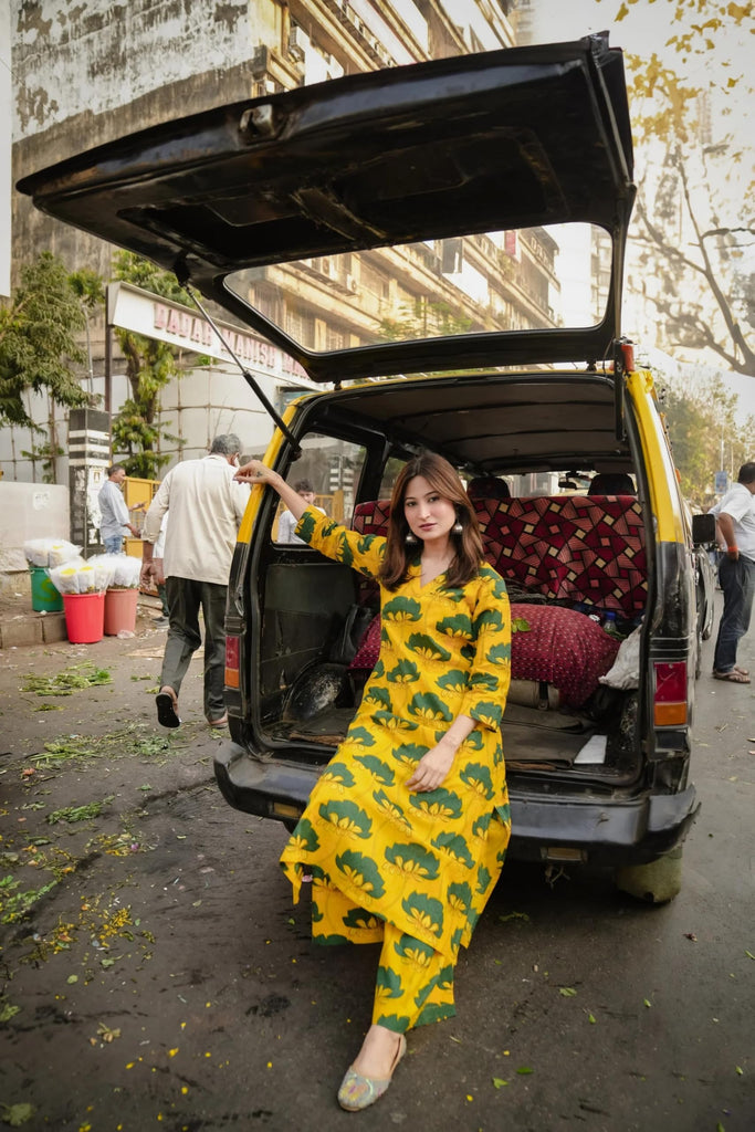 Anni Designer Women'S Rayon Viscose Straight Printed Kurta With Palazzo (Humnava Yellow_Xxl_Yellow_Xx-Large),Yellow,2XL,Rayon,Regular,